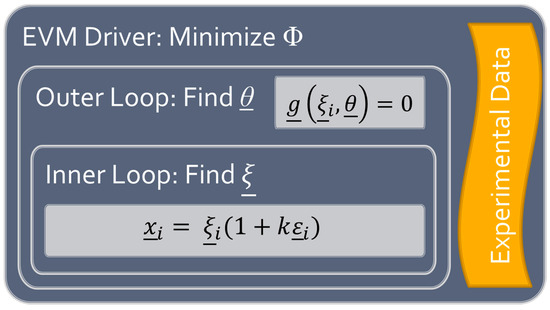 As mentioned previously, EVM forces the researcher to consider all sources of error, including the error associated with independent variables (such as feed composition) and (measured) cumulative copolymer composition. To obtain estimates of the “true” values of both the independent variables and the parameters, the EVM program uses a nested-iterative loop (this is represented schematically in Figure 1, with variables defined in the discussion below). The inner loop searches for “true” values of the independent variables, since there is inevitably some error associated with the measured values. Mathematically, we can relate the vector of measurements (xi) to the vector of their unknown “true” values (ξi) and an error term (kεi), according to Equation (4). In the error term, k is a constant that represents the magnitude of the error and ε (error) is a random variable that is typically uniformly distributed on the interval [−1, 1] (an additional explanation is included in Appendix A, for the interested reader). At the same time, the outer loop uses a copolymerization model (such as the ICC model, Equation (1)) to relate the “true” variables and the parameter (reactivity ratio) estimates, as shown in Equation (5).