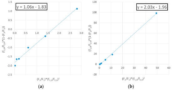 The more pressing concern with the F-R method (also described by Hagiopol [15]) is the lack of symmetry. Thus, values of r1 and r2 depend on which monomer is selected as M1. To demonstrate this point, the data collected by Undin et al. [11] are evaluated with M1 = MDO (which was performed incorrectly in the original work; see Figure 4a) and with M1 = VAc (performed herein for the demonstration; see Figure 4b).