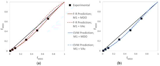 Finally, we can visually evaluate the prediction performance of the reactivity ratio estimates, which involves comparing the experimental values to those predicted by the ICC equation (Equation (1)). As shown in Figure 6, the symmetry issues associated with the Fineman-Ross (F-R) technique have a significant impact on the prediction performance (red curves, Figure 6a). In contrast, both of the predictions using EVM-obtained RR estimates (blue curves, Figure 6b) are in agreement with each other and with the experimental data. This is compelling evidence to choose non-linear parameter estimation techniques like EVM over the statistically incorrect linear parameter estimation techniques.