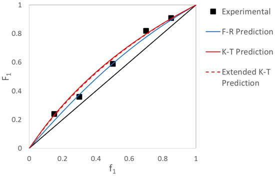 Figure 9 indicates that the experimental data points were subject to some degree of error, especially for f1,0 = 0.3 and f1,0 = 0.7. Thus, experimental difficulties are likely the culprit here. The best way to mitigate this type of problem is to design experiments, replicate copolymerization runs and use EVM for parameter estimation. Additionally, using full conversion data with the cumulative model gives a more complete picture of copolymerization kinetics; researchers do not have to struggle with the experimental challenges of collecting low conversion data.