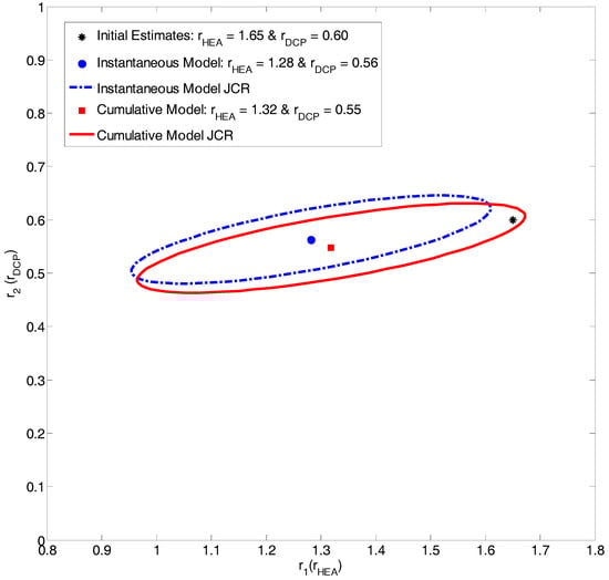 EVM-obtained RR estimates and JCRs for the copolymerization of HEA/DCP using the instantaneous model (rHEA = 1.28; rDCP = 0.56) and the cumulative model (rHEA = 1.32; rDCP = 0.55).