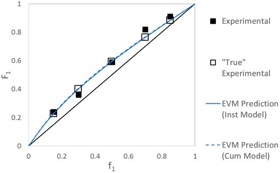 The reactivity ratios calculated using the EVM program are as described in Table 3 and Figure 8. The converged program also provides the best possible estimates of “true” values of the variables, a feature which was described in Section 3.3 (see also Appendix C, Section C.2). Thus, in Figure 9, we can compare the experimental (measured) values to the “true” experimental values and the EVM model predictions (both instantaneous and cumulative).