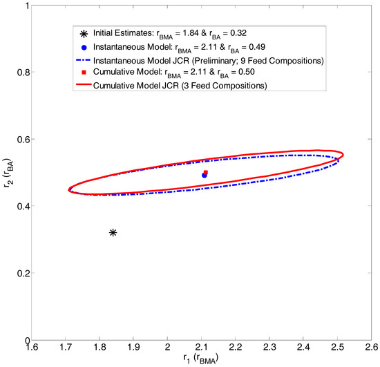 To account for composition drift (even at low conversions), the cumulative copolymerization model (Equations (2) and (3)) should be used. Using direct numerical integration to solve this system of equations ensures that the feed composition (f1) is considered as a function of conversion, thus taking any composition drift into account mathematically. To establish whether unidentified composition drift is the culprit in the current experimental data set, we can evaluate the data using both the instantaneous and cumulative models and compare the results (Figure 8, discussed below). In reality, using the cumulative model would also increase the amount of data available for analysis, as the copolymerization would be allowed to go to higher conversion levels (and data would continue to be collected); in addition, the experimental information is enhanced, anyway, since both conversion and copolymer composition data are included; see also Section 4.2.1. Ultimately, this would increase the degree of confidence in the reactivity ratio estimates and decrease the size of the JCR.