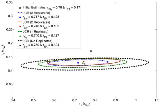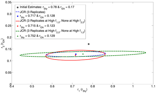 For the interested reader, more information about Equation (8) (and relevant variables) is given in Appendix A. However, since the program calculates the G matrix “behind the scenes”, the average user should focus on the fact that the G matrix gives valuable information about the parameters (θ, specifically r1 and r2). In fact, the inverse of the G matrix provides an approximation of the variance-covariance matrix for the parameters. With this information, the MATLAB program can plot joint confidence regions (JCRs), which are discussed in what follows.