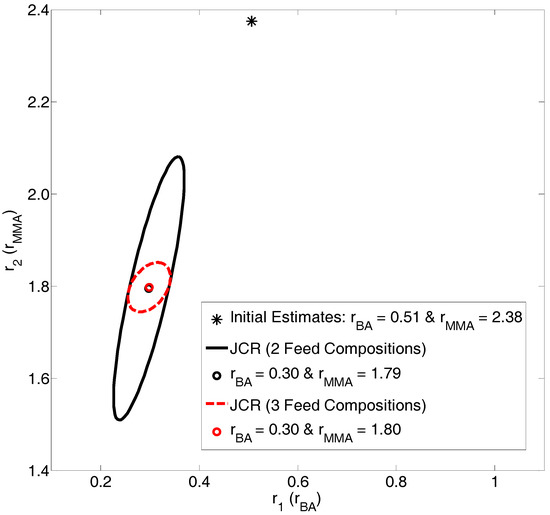 Over the years, many different (and incorrect) methods have been implemented for reactivity ratio estimation. Linear parameter estimation techniques (such as the Mayo-Lewis method (method of intersections), the Fineman-Ross method and the Kelen-Tüdös method) were used previously due to lack of computational power. However, these techniques should not be used, as linear estimation techniques applied to non-linear models result in faulty parameter estimates and a distorted error structure [1,2,3]. Other common sources of error in parameter estimation include poorly designed experiments—too few (usually unreplicated) data points, chosen at random—inherent experimental difficulties (especially at low conversion levels) and inappropriate kinetic models. Ultimately, this has created a wide variety of reactivity ratios in the literature, even for similar copolymer systems (see, for example, reactivity ratios associated with the copolymer of 2-acrylamido-2-methylpropane sulfonic acid and acrylamide, as summarized by Scott et al. [4]).