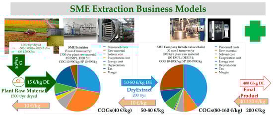 The extraction company operates with about 40 €/kg dry extract COGs at the cost distribution as depicted, which is dominated by herbal raw material purchasing costs including solvent and staff. The extraction industry sells to the final formulation and tableting/packaging partners with about 10 €/kg dry extract margin, to which value is added by gaining about 200 t/year dry extract out of about 1500 t/year raw dry herbal raw material. The dry extract has, in the meantime, a value/cost of about 50–80 €/kg dry extract before it is tableted and packed as a phytomedicine, with typical market values of about 400 €/kg dry extract on the consumer market.