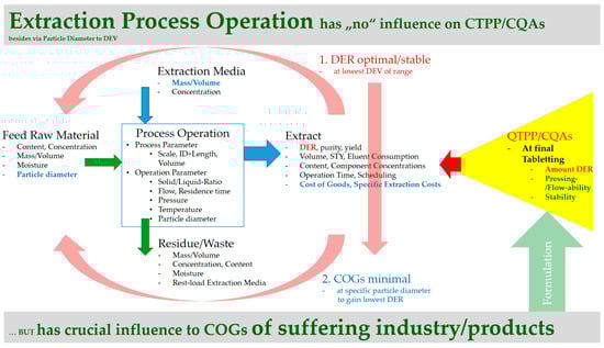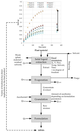 Figure 3 depicts a flowchart describing the process from extraction to solvent/auxiliary evaporation/recycling, granulation, and formulation/tableting. Influencing parameters are listed for each unit operation. Easily derived from that overview, critical product quality attributes are only gained at the last tableting step. The effects of the preceding process steps do not influence the criteria for tableting ability, stability, and overall content.