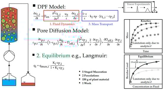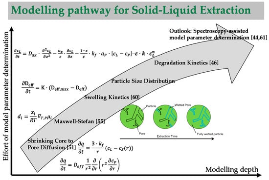 Figure 6 exemplifies the experimental efforts of model parameter determination at the laboratory scale with increasing modelling depth for the rapid development over the last 10 years or so, starting with shrinking-core and pore diffusion effects taken into account [52,54], diffusion interference of different molecules by Maxwell-Stefan [55,60], shrinking and swelling mass transport kinetics of non rigid herbal raw matrices during extraction up to particle size distributions, and degradation kinetics caused by temperatures [46] up to a recent development, the spectroscopy-assisted model parameter determination [44,61].