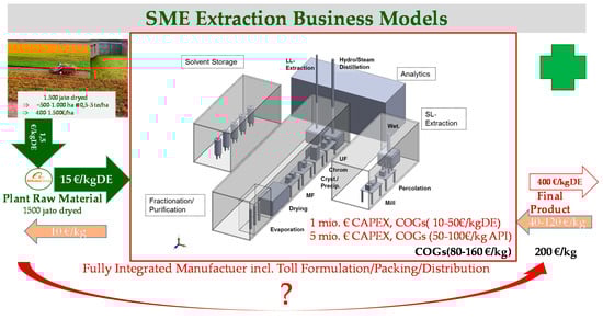 Business models along the value chain: cultivation, extraction, formulation and sales. DE, dry extract; SME, small and medium enterprises; EMPL, employee; DER, drug extract ratio; COG, cost of goods; SP, selling price.