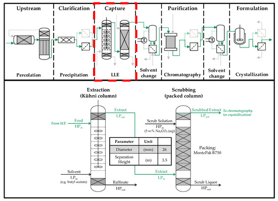 The first column of the first liquid-liquid extraction is filled with the SLE extract before the test, as this is the continuous phase. In the subsequent Na2CO3 scrubbing, the salt solution is the heavy continuous phase. The flowsheet of the described procedure and the position of the extraction and scrubbing stages in the overall production chain are shown in Figure 2.