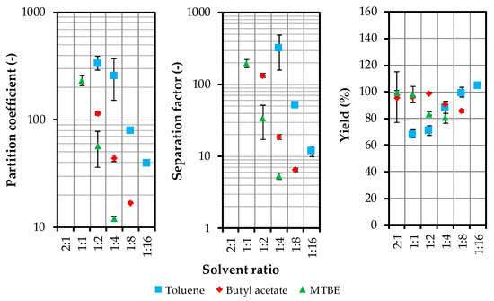 Distribution coefficient, separation factor and yield as a function of solvent ratio. MTBE (methyl tert-butyl ether).