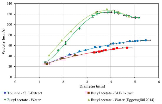 In the curves for the two systems with the solvent and the SLE extract, there is no maximum speed. For butyl acetate, the maximum droplet volume is 35 µL, the corresponding droplet diameter 4.7 mm, and for toluene 50 µL and 5.6 mm. The toluene droplets always have a faster rate of rise due to the greater difference in density between the solvent and the SLE extract.