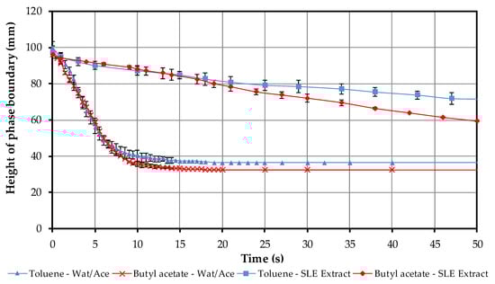 In the next step, the settling behavior of toluene and butyl acetate is investigated with the SLE extract. The results of these studies are shown in Figure 6. First of all, it can be observed that the settling time is many times longer than in the first tests (see Figure 6). After approximately 100 s sedimentation with butyl acetate, the SLE extract is complete and a clear light phase has been formed. The settling time for toluene is 250 s. This corresponds to an increase by a factor 5 for butyl acetate and factor 7 for toluene as compared to the settling time with the water/acetone mixture.