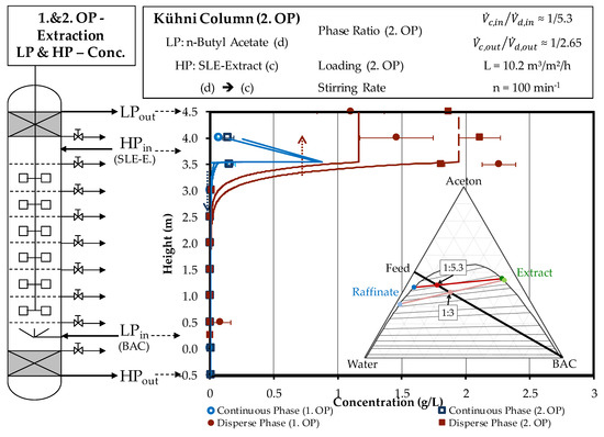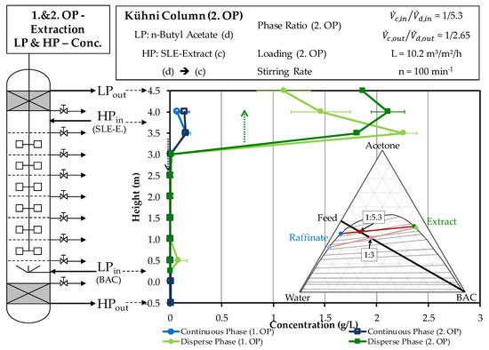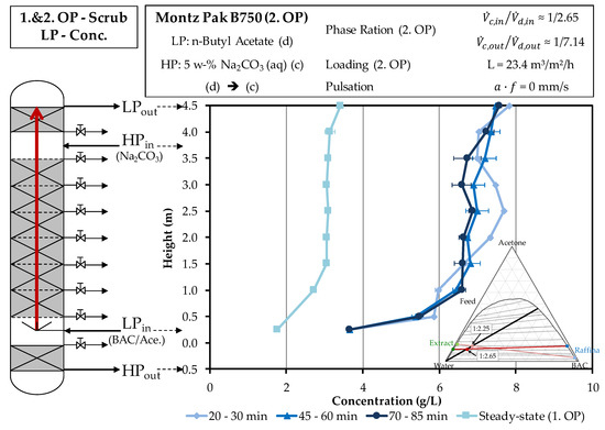 The concentration at the entry of the light phase is twice as high due to the reduced solvent ratio of the second operating point in the scrubbing. At the outlet, the light phase of this operating point reaches a concentration of more than 7.5 g/L. This corresponds to a doubling of the concentration, which also occurs at the first operating point, when acetone is extracted from the light phase to the heavy phase.