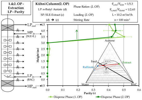 The selected phase ratio between the solvent phase and aqueous SLE extract phase for the first operating point is 1:3, which should allow for safe operation of the column. If a higher solvent content was used, the risk of phase inversion would increase. This is because the solvent phase extracts the acetone from the aqueous, heavy SLE phase. Losses may occur if the solvent volume is too low. The single-stage shaking tests show a yield of over 90% at this solvent ratio. This should be significantly increased by the multi-stage extraction column, as predicted by the simulation. Furthermore, this ratio promises very high separation factors and partition coefficients.