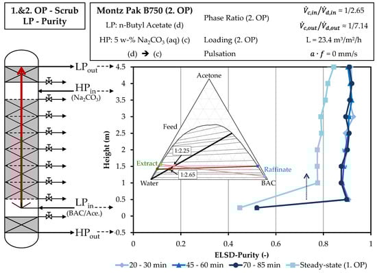 The stationary state is reached after one hour when purity is considered. Across the column height, there is an increase in purity. This indicates that secondary components pass over the entire column height into the salt phase. The multi-stage nature of the column thus has a positive influence on the purity as compared to single-stage tests. The purity increases to over 80% from just under 45%. The density of the heavy phase is reduced due to the extraction of acetone from the solvent phase. This is also the reason for the increase in density of the light phase, which almost corresponds to the density of pure butyl acetate (882 kg/m³). From this it can be concluded that the scrubbed extract phase consists to a very large extent of butyl acetate. The results of the purity tests of the first operating point of the scrub indicate that the purity can be further increased by a higher throughput of the continuous phase. This increased countercurrent flow causes the disperse phase, with artemisinin and secondary components, to rise more slowly and the residence time in the column increases. Furthermore, more secondary components should be able to pass into the heavy phase, as this has a larger capacity due to the higher volume flow.
