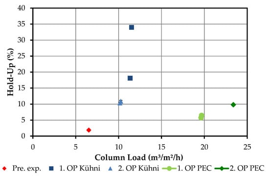 Overview of investigated hold-ups in Kühni and packed extraction columns. OP (operating point), Pre. Exp. (preliminary experiment), PEC (packed extraction column).