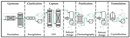 The demand for naturally derived pharmaceuticals continues to grow [1,2]. Pharmaceuticals, in contrast to food supplements and natural plant protection agents from plant extracts, must be purified. One example is the anti-malaria agent artemisinin, which is extracted from Artemisia annua L. This agent is administered as a pure substance. Therefore, the plant extract must be purified to pharmaceutical grade. Previous studies have shown that the substance could be extracted by solid–liquid extraction (SLE) using percolation or pressurized hot water extraction (PHWE) [3]. Typically, the purification is performed by liquid–liquid extraction (LLE) (see Part II) chromatography and a final crystallization (see Part IV) [3,4,5,6,7,8,9,10,11,12].