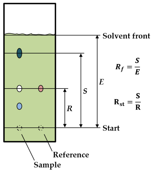Figure 3 shows the general approach to TLC. The sample and the reference substance were applied to the bottom of the plate. There are two characteristic factors to characterize the TLC chromatogram. The first is the retention factor Rf, which is the ratio from the substance S over the eluent front E. The second factor is the retention factor for a reference substance Rst. Both factors can be calculated with Equations (1) and (2). Suitable Rf factors are approximately 0.3, but the more realistic retention factor for the estimation of the retention is the Rst value [13,14].