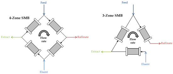Schematic process setup for the 4-zone simulated moving bed (SMB) and the reduced 3-zone SMB (acc. to [30,31,32]).