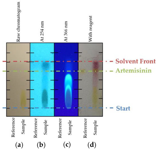 Evaluation of the TLC plates using the example of methanol/isopropyl alcohol (30/70). On the left side of the plate is a standard artemisinin solution; on the right side is the extract sample. In part (a) is the normal chromatogram, in part (b) is the chromatogram under ultra violet (UV) light (at 254 nm), in part (c) under 366 nm, and part (d) after treatment with vanillin–phosphoric acid reagent.