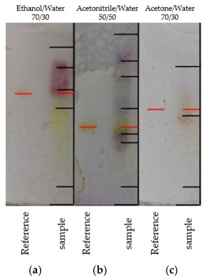 In Figure 6, three chromatograms of the cyano (CN) plate are shown. In Figure 6a, a run with 70 vol % ethanol and 30 vol % water was carried out. Figure 6b shows a run with 50 vol % acetonitrile and 50 vol % water, and Figure 6c shows a run with 70 vol % acetone and 30 vol % water. In the first two chromatograms, a good separation was achieved. Furthermore, the run with ethanol and water showed that the Rf value of the artemisinin was higher than in the other chromatograms. Figure 6c shows a run with a bad separation.