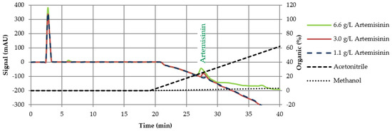 The TLC experiments point out that the most promising eluent for the cyano stationary phase is a combination of water and acetonitrile. In first column experiments, it was shown that the affinity of the artemisinin in water was too low to bind on the stationary phase. Because of this, a buffer system was used to increase the polarity of the loading eluent. The chromatograms of three different standard solutions are shown in Figure 7. This figure demonstrates that the artemisinin binds to the column and elutes at approximately 27 min. In this method, a 5 CV wash step was carried out followed by a 10 CV gradient from 100 vol % buffer to 95/5 vol % acetonitrile/methanol. The modification with methanol increased the separation performance.