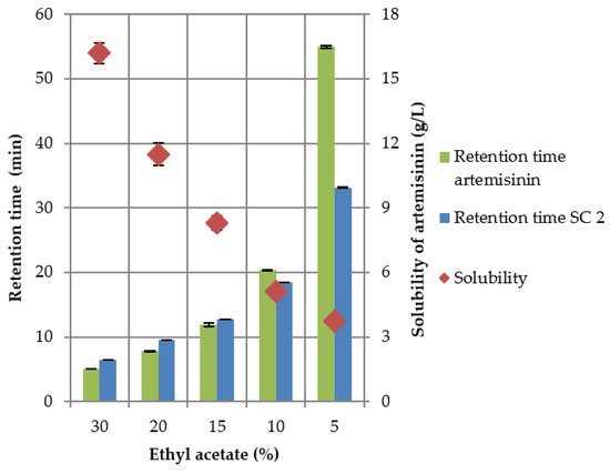 Retention time of artemisinin and SC2 over the ethyl acetate content. On the secondary axis is the corresponding solubility of the artemisinin.