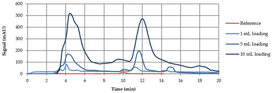 The first step of scale-up to the preparative scale involved loading experiments to determine the optimal loading conditions. Therefore, loadings with 1 mL, 5 mL, and 10 mL of the extract were performed, respectively. Additionally, a chromatogram with the reference substance was run for comparison. These chromatograms are described in Figure 10.