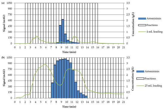 Fractionation of the artemisinin with different loadings: (a) 4 mL and (b) 25 mL.