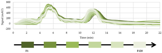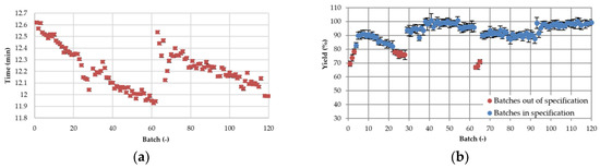 In a next step, process stability was investigated, an aspect which is important for the manufacturing operation in the pharmaceutical industry. Therefore, 120 runs were carried out. For the product fraction, the cut points from fractionation studies were chosen, which had been determined earlier. The product fraction should have a purity >97% and a yield >80%. In Figure 12, all 120 runs are shown as chromatograms. In this figure, a displacement of the SC2 peak (side component peak no. 2 at approximately 12 min retention time) can be seen. To specify this displacement, the first moment from 10 to 15 min is shown in Figure 13a. When the deviation of the first moments of the chromatograms exceed 5% compared to the starting run, the column should be replaced, or cleaned and regenerated. In this experiment, this point was reached after 61 runs. At run 62, a new column was used. The cut points for the product fractions had to be adapted because of this replacement. The yield of each fraction can be seen in Figure 13b. Between some runs (e.g., between run 28 und 29), the cut points were adapted, which resulted in a significantly increased yield.