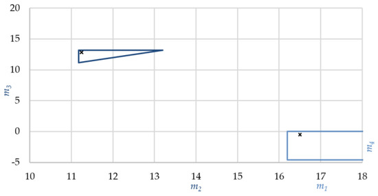 The split of the SMB separation was between SC1 and the artemisinin. Because of this, the Henry coefficients of SC1 and artemisinin were used to calculate the triangle operation region of the maximal feed flow. Normally, the same coefficients are used for the regeneration area, however in this case there were more than two components relevant for the process design. For the regeneration of the eluent (the fourth zone), none of the fastest moving components should be allowed to leave this zone. In our case, this was the SC0 impurity, which eluted with the dead volume, so the m4 had to be less than zero. The lower boundary was −4.6 due to the zero volumetric flow in zone 4.