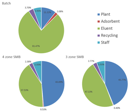The cost distribution is shown in Figure 16. In the diagram of the batch process, it can be seen that the eluent consumption dominates the purification costs. Cost distribution of the SMB processes is dominated by about half of the costs generated by the amortization of the plant equipment investment cost. Approximately the other half results from the eluent consumption. Due to the high percentage of the plant investment amortization, there is a potential to lower the purification costs through the economy of scale effect. In conclusion, a purification using the batch process results in specific costs of 0.47 €/gartemisinin compared to 0.45 €/gartemisinin in the 3-zone SMB and 0.40 €/gartemisinin in the 4-zone SMB process. In the stage of process development and design which is used in this article, no significant difference is shwon.