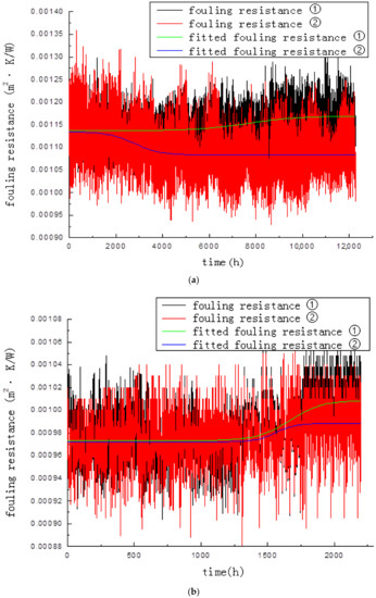 Trend diagram of fouling resistance in the experimental process. (a) Fouling resistance in 1 kHz magnetic and contrast experiments. (b) Fouling resistance in 5 kHz magnetic and contrast experiments. ① contrast experiment data. ② magnetic experiment data.