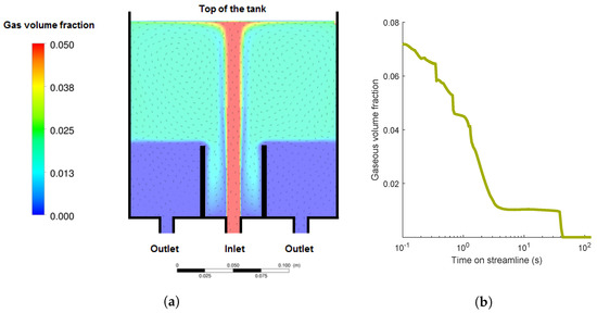 In this section, the aggregation models are coupled with Euler/Euler CFD simulations for the commercially available DAF system from Enviplan (AQUATECTOR®Microfloat®) with a flow rate of 75 L/h. The geometry and the distribution of the gas volume fraction of the tank are illustrated in Figure 1a. From the inlet to the top of the tank, the gas volume fraction was quite high in a narrow area, which was the main stream of the tank. At the top of the tank, most of the bubbles remained in the foam. The other areas of the tank did not have such a high gas volume fraction. Close to the outlet, was zero. Exemplarily, the heteroaggregation on one streamline of the DAF tank was investigated in detail.