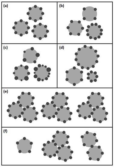 Illustration of the different aggregation models, where grey spheres represent bubbles and dark spheres correspond to microorganisms: (a) Averaged: several monodisperse cells aggregate on monodisperse bubbles; loading of bubbles is averaged; (b) Not Averaged: several monodisperse cells aggregate on monodisperse bubbles; loading of bubbles is distributed; (c) Poly.Cells: several polydisperse cells aggregate on monodisperse bubbles; (d) Poly.Bubbles: several monodisperse cells aggregate on polydisperse bubbles; (e) Clustering Averaged: formation of aggregates with multiple monodisperse bubbles and monodisperse cells; bubble and cell number per cluster are averaged; (f) Clustering: formation of aggregates with multiple monodisperse bubbles and monodisperse cells; bubble and cell number per cluster are distributed.