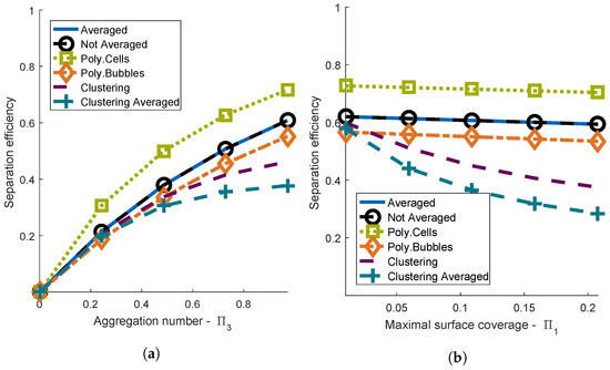 The separation efficiencies of the models Clustering and Clustering Averaged were lower than the separation efficiencies of the model Averaged in the whole range of and . Additionally, the model Clustering Averaged yielded lower separation efficiencies than the model Clustering. This could have been caused by an overestimation of the cluster formation for the model Clustering Averaged. In general, clustering reduces the efficiency because the formation of clusters with multiple bubbles reduces the available surface area of bubbles. Therefore, the frequency of the attachment of cells decreases.