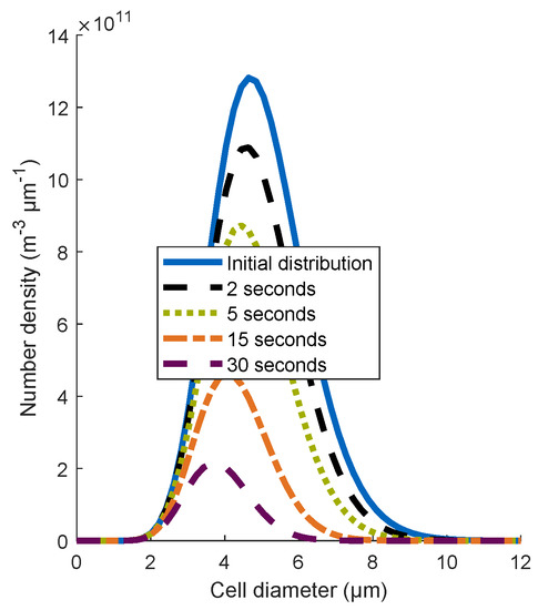 To investigate the influence of a distributed cell diameter on the efficiency of the flotation process, the number density distribution of unbounded cells was computed at different simulation times (see Figure 4) for the model Poly.Cells. The applied relative standard deviation was . Each distribution below the initial distribution signified a subsequent simulation time. Due to aggregation with bubbles, the number density distribution of free cells decreased with an increasing simulation time. Furthermore, the number density of bigger cells decreased significantly faster than the number densities of smaller cells. Since the mass of a single cell is proportional to the cell diameter cubed, most of the mass of the cells is represented in larger cell sizes and aggregates quite fast. Therefore, the efficiency increased using a gamma distribution for the cell diameter, as can be observed in Figure 3.