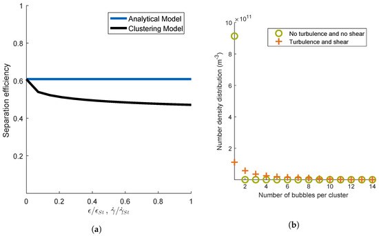 To detect the main effects influencing the formation of aggregates with multiple bubbles, the influence of the flow conditions were investigated. The turbulent dissipation rate and the shear rate were varied, while the dimensionless groups and were kept constant (see Figure 5a). Thus, the aggregation mechanisms due to laminar shear and turbulent motion were varied. The turbulent dissipation rate and the shear rate were plotted depending on their standard parameters and . Since and were kept constant, the efficiency for the analytical model did not change over the entire parameter range. In absence of shear and turbulence , the separation efficiencies of the models Clustering and Averaged were equal. With increasing and , the efficiency of the Clustering model decreased significantly. Figure 5b illustrates two number density distributions of clusters with a certain bubble number at a residence time of 10 s. Therein, the green dots represent the simulation of the model Clustering with no turbulence and no shear, i.e., and . The orange dots represent the simulation with the standard parameters for and . In the case of no turbulence and no shear, it can be observed that there were almost no aggregates consisting of more than one bubble. The aggregation mechanism was only due to sedimentation. This aggregation mechanism did not seem to cause clustering of aggregates with multiple bubbles significantly. On the contrary, for high turbulence and high shear, aggregates consisting of several bubbles were formed. This lowered the efficiency, since the available surface of bubbles decreased, where cells could aggregate. It can be deduced that shear and turbulence caused clustering.