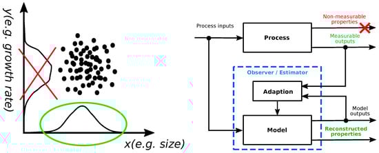 Multicellular systems are not only found at the core of many fundamental biomedical processes like cell differentiation [1] and wound healing, but also play an essential role in a wide spectrum of biotechnological processes ranging from pharmaceutical manufacturing [2,3] to biopolymer production [4] to biological waste-water treatment [5]. The individual cells do not only interact with each other, but also with their environment. These interactions are affected by individual cellular properties like cell volume and gene/protein expression levels, which underlie a certain cell-to-cell variability, i.e., the properties appear distributed within the cell population. The reasons for such heterogeneities are manifold, including differences in local substrate concentrations [6] or non-synchronous cell-cycles [7], as well as stochastic effects on the genomic and proteomic level [8]. From an evolutionary point of view, this variability is argued to benefit the robustness of the cell population against rapid environmental changes. However, on an industrial scale, such variabilities can have undesired effects like decreased product yields and even result in an unstable behavior [9]. Therefore, close monitoring of the cellular properties and their distribution within the population is of paramount importance. In the last few decades, sophisticated measurement techniques such as flow and mass cytometry have been developed that allow inferring the distributions of cellular properties [10]. Nevertheless, these only supply information on representative samples from the cell population at discrete time points, so-called “snapshot data” [11]. Moreover, due to technical limitations (no established staining procedure), financial considerations (expensive dyes) or safety restrictions (hazardous staining procedures), only a limited amount of information is available on at least some of the cellular properties. A descriptive example is depicted in Figure 1: Cells are characterized by individual cell size and growth rate. Though individual growth rate can be accessed via sophisticated experiments in principle [12], measurement of individual cell size is much easier and less expensive. Assuming that exclusively the latter is measured, instead of a two-dimensional distribution over both variables, only a one-dimensional number distribution over the cell size is obtained from flow cytometric analysis.