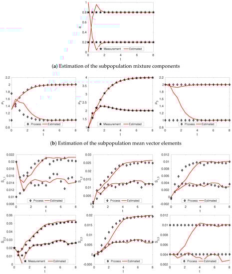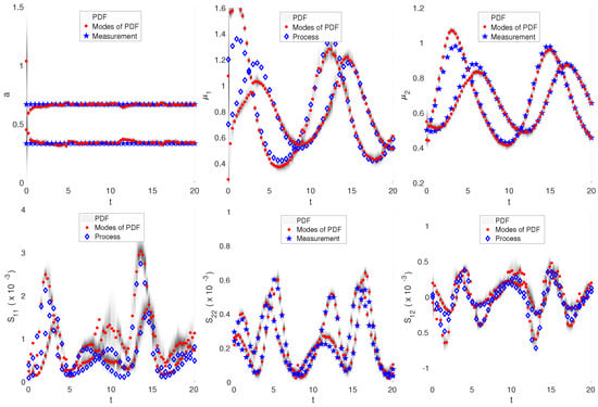 Simulation results are depicted in Figure 3. The set of particles represents the PDF of the estimated state vector (depicted in grey scale, darker areas indicating regions of higher particle density). The measurements (and also the cell populations NDF) were approximated by two GMDs. Initially, the particles were evenly distributed (broad PDF), reflecting the uncertainty about the current state of the process. However, after a short period, a bimodal PDF was obtained indicating that the particles had focused within two regions. The PDF modes represent the particle filters’ estimates for the state vectors. It can be seen that most states were accurately estimated. In general, the estimates of mixture components and means seemed to be more reliable than the estimates of the covariance. Here, the estimate for , i.e., the variance with respect to non-measurable component , shows some significant deviations at some time points. The simulation showed that the estimates became worse for periods in which the two measurement GMDs overlapped, yielding a kind of practical non-observability. This was particularly obvious in the period where the uncertainty in the estimates increased (the PDF became broader), and the PDF modes did not represent good estimates for the measurements any longer. However, after a short time, the estimator was able to recover. It is also clear that the particle filter had to converge before a new critical practical non-observability situation arose. It has to be mentioned that the implemented particle filter algorithm was relatively simple and could be improved further by taking into account advanced techniques, e.g., different resampling strategies and improved particle prediction steps [13]. Another point for fine-tuning of the performance was found in the approximate moment method for the prediction of the state vectors: here, a more complex approximate moment closures could be considered.
