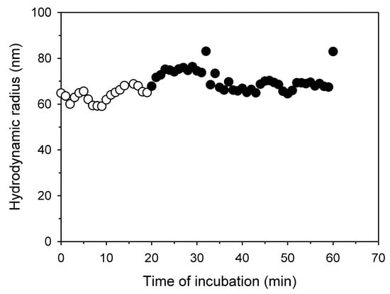 Development of the hydrodynamic radius of the polyplexes with incubation time. White symbols: initial incubation in Hepes-buffered glucose solution (HBG), black symbols: after dilution with Opti-MEM (1 mL), N/P ratio: 20.