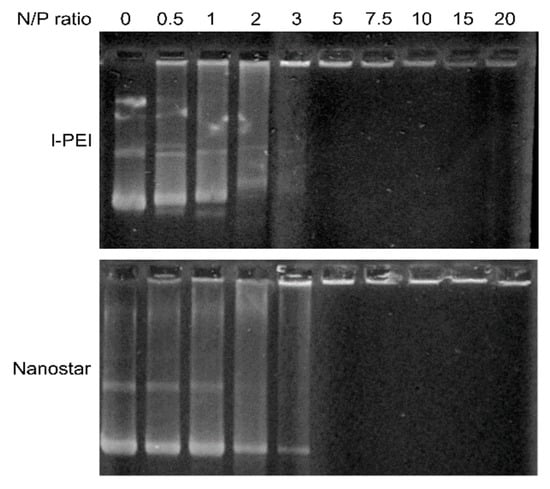 While the zeta potential gives an idea of the N/P ratio required for charge compensation, a direct evaluation of the polyplexes’ net-charge is possible in the gel retardation assay, Figure 2. According to this assay, polyplexes with an N/P ratio >3 (Nanostar) no longer move towards the anode in an electrical field, i.e., have a zero or positive net-charge. For comparison, similar observations are already made for l-PEI at N/P ratio >2.