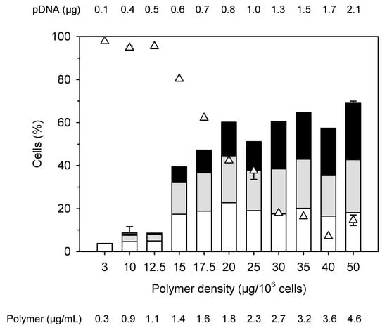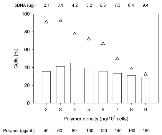 Optimization of the polymer density in high cell density (HCD) transfections of Jurkat cells. (Total cells: 5 × 106 cells, transfection volume 0.25 mL, bars represent the percentage of transfected cells, △: viabilities, data represent the averaged values of one experiment carried out in duplicate. An N/P of 10 was adjusted in all experiments.).