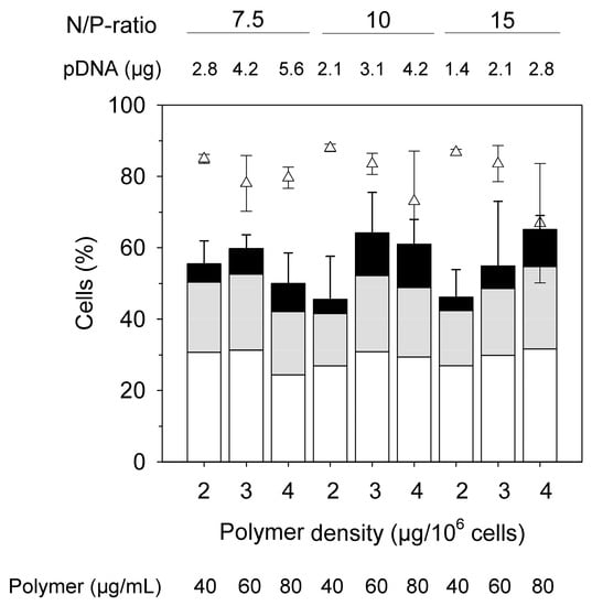 HCD transfection as a function of the N/P ratio and the polymer density. (Total cell number: 5 × 106 cells, transfection volume 0.25 mL, 2 mL Eppendorf tube, amount of pDNA is given per sample. Bars represent the percentage of transfected cells, with white: low producers, grey: middle producers, black: high producers; △: viabilities. Shown are mean values ± SD, n ≥ 3, SD given for total transfection efficiencies and for viabilities.)
