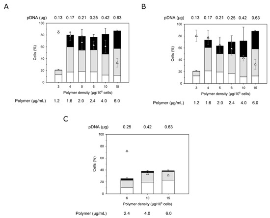 Transfection in Eppendorf tubes as a function of the polymer densities. (A) 90 min incubation, (B) 30 min incubation, (C) 15 min incubation. (0.2 × 106 cells, N/P 10, transfection volume 0.5 mL. Bars represent the percentage of transfected cells, with white: low producers, grey: middle producers, black: high producers; △: viabilities. Shown are mean values ± SD, n ≥ 2, SD given for total transfection efficiencies and for viabilities.)