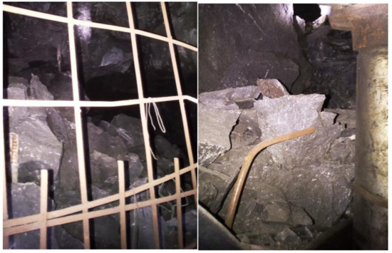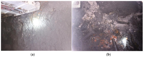 During mining of the grouting area, there was no occurrence of coal wall spalling or tip-to-face roof falling. The working face traversed the old mining caving zone safely and smoothly. The rock mass exposed during the mining is shown in Figure 16. It can be seen that the coal wall and the tip-to-face roof in front of the working face have good integrity. The coal wall is neat after cutting. Thus, a good grouting effect has been achieved.