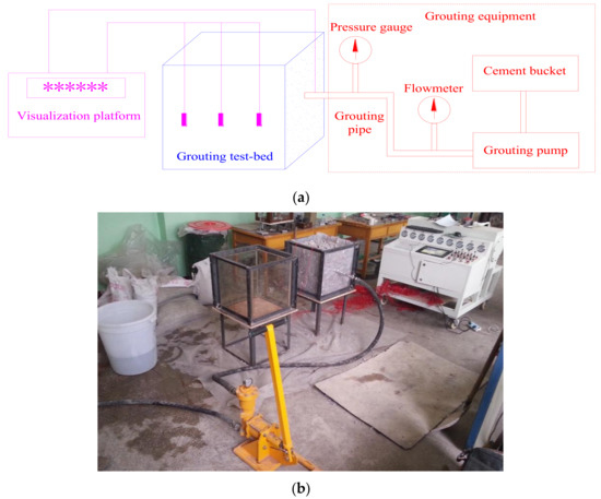 To study the law of grouting diffusion in a fractured porous rock mass, a series of grouting experiments were performed in the self-developed three-dimensional visualization grouting experimental system, as shown in Figure 2. The system mainly consists of three parts: grouting test-bed, grouting equipment and visualization platform.
