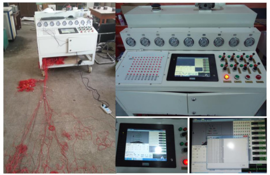 The grouting test-bed, which has dimensions of 0.5 m × 0.5 m × 0.5 m, is a frame welded by angle steel and surrounded by tempered glass. One piece of the tempered glass can be replaced by glass with grouting holes at different positions to simulate different grouting heights. Additionally, the bottom of the test-bed is a piece of wood with five grout overflow holes. The grouting equipment includes a cement bucket, grouting pump, pressure gauge, flowmeter, grouting pipe, stop valve, hole packer, etc. A grouting pump is a kind of manual pressure grouting pump (MG-808, Shangqin High Pressure Grouting Technology Co., Ltd., Shanghai, China). The pressure gauge and flowmeter, which are used to measure the grouting pressure and grouting volume, respectively, are installed on the grouting pipe. The visualization platform is a self-developed platform for monitoring grout diffusion under laboratory conditions. It includes the signal system (Patent No.: ZL 2016200214895), flow sensors, pressure sensors, wire, an industrial personal computer, etc. The visualization system can monitor the grouting pressure, grout diffusion range, the time of grout diffusion to the sensors and the grout diffusion pressure at the sensor during the grouting process. The visualization platform of the grouting diffusion is shown in Figure 3.