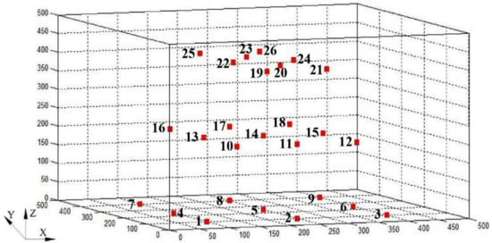 In this experiment, 26 sensors of the visualization platform were embedded in the grouting test-bed. The sensors were arranged at 50 mm, 200 mm, and 300 mm vertically from the grouting hole. The positions of the sensors in the grouting test-bed are shown in Figure 4, and their coordinates are shown in Table 2.